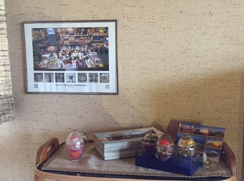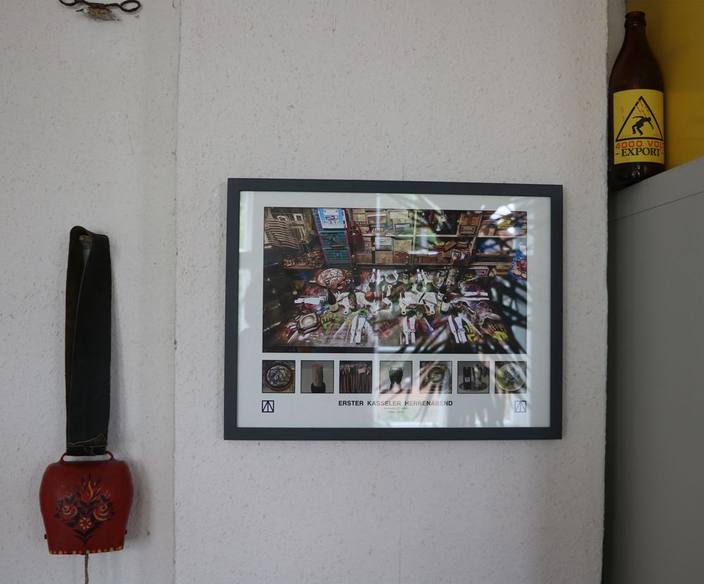 Auf dem Tisch liegt eine – mit Airbrush bearbeitete – 19 mm-starke Holzplatte, die sogenannte Tafel des Ersten Kasseler Herrenabends. In der Geschichte des E • K • H • A ist diese Tafel die siebte ihrer Art. Das Bildmotiv auf ihrer Oberseite besteht aus sieben, übereinander gelagerten, teilweise transparenten Ebenen. Auf der Tafel befinden sich alle Objekte, die mit dem Herrenabend und seinen Ritualen zu tun haben.