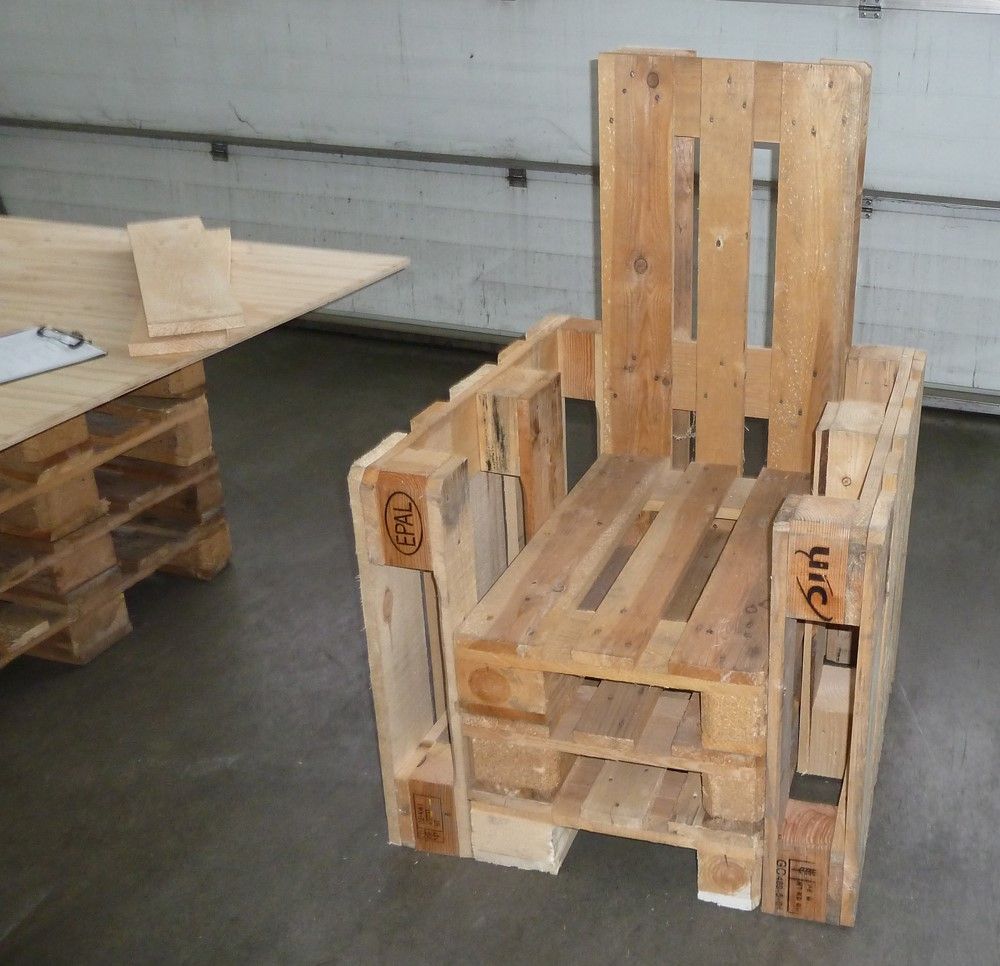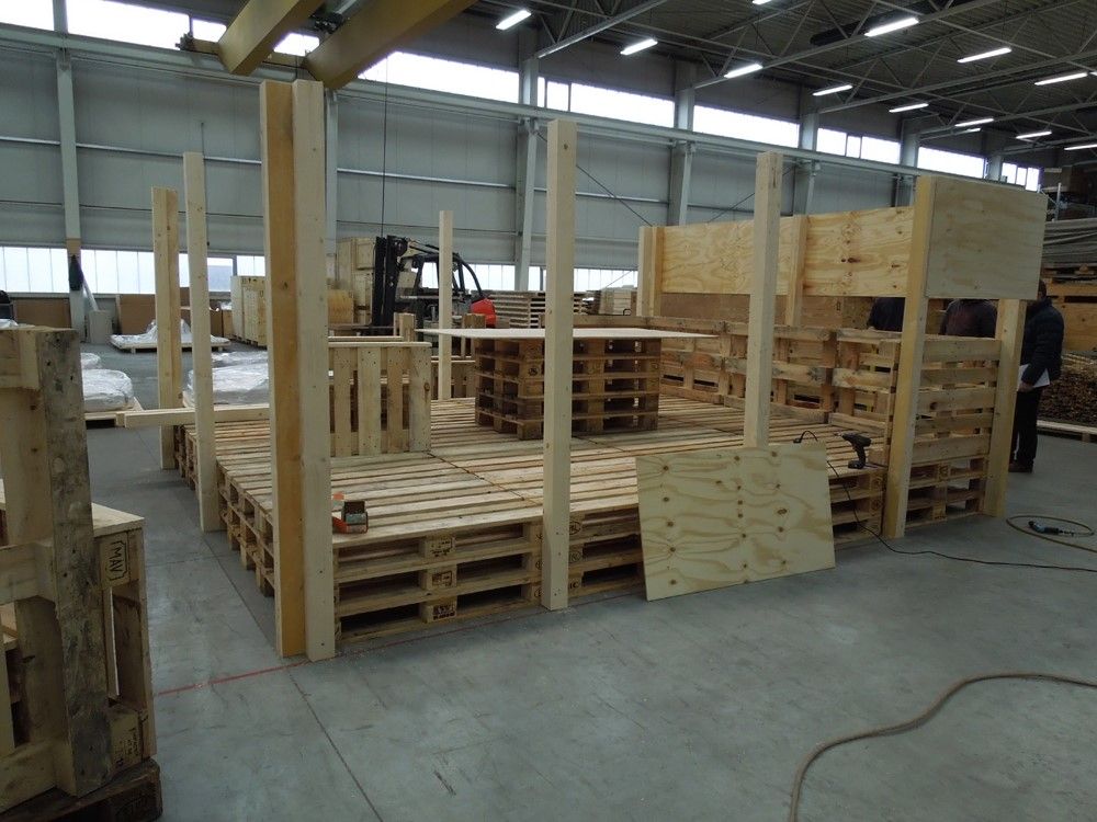 Das Podest hat ein Format von 400 x 480 cm, eine Höhe von 43,5 cm und besteht aus drei Lagen Euro-Paletten, die durch Kabelbinder miteinander verbunden sind. Für eine Lage werden 20 Paletten (80 x 120 cm, Höhe: 14,5 cm) benötigt, für drei Lagen also 60 Paletten. Der Tisch und die Stühle sind auch aus Paletten gebaut.