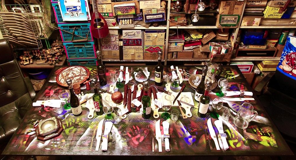 Im Zentrum dieses Raumes stehen wieder der Tisch mit der Herrenabend-Tafel und die sieben Stühle drum herum. Und auf der Tafel finden sich wieder all‘ die Objekte, die der Besucher der Frühjahrs-Ausstellungs-Installation hinter dem Holzband immer nur erahnen durfte. Jetzt im Stadtmuseum, darf der Besucher die Installation betreten – und wird so zum Teil der Installation und somit zum Teil der Kunst.